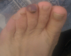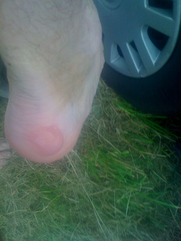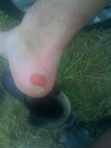 I unveiled a very raw burst blister on my right heel, a matching sized (but unburst) blister on my left heel, a smallish blister on the top of my right foot and a huge blood filled blister on the middle toe of my left foot – this toe lost it’s toe nail some 4 – 5 weeks ago when training (as did the toe next to it) and my lower back had been rubbed raw but I didn’t care as I had made it within the time.