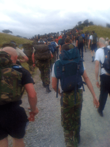 Once parked up we got changed into our t-shirts, shorts, applied petroleum jelly to our feet and put on socks and boots. We filled our pockets with bananas, Haribo sweets, flap jack and energy drinks, hefted the bergans to our backs, grabbed a couple of small bags filled with a pound of sand each and headed for the start. We’d not gone more than 2 or 300 metres before we saw a black Ford Transit style van from which a group of military looking blokes jumped out – these boys looked fit and more than capable of completing the course – intimidating!
